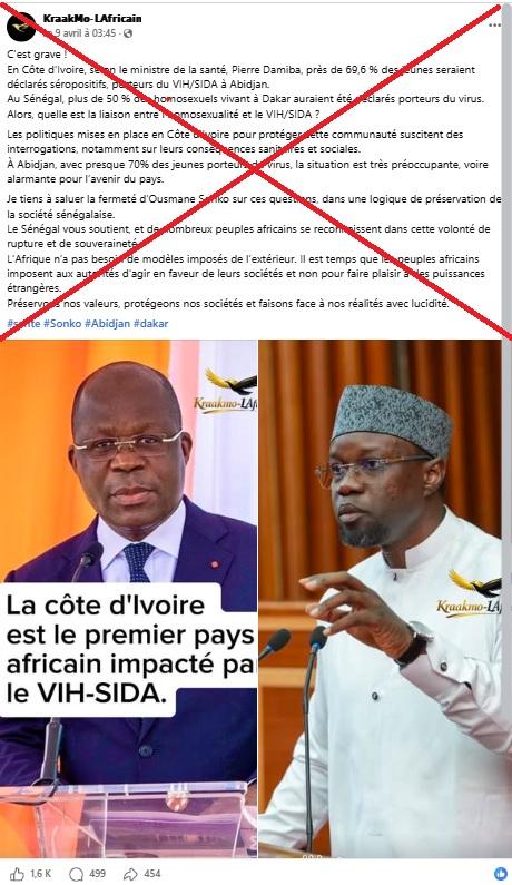"C’est grave ! En Côte d’Ivoire, selon le ministre de la Santé, Pierre Dimba, près de 69,6% des jeunes seraient déclarés séropositifs porteurs du VIH/SIDA à Abidjan", peut-on ainsi lire dans un post Facebook qui cumule 1.600 mentions "j’aime" depuis sa publication le jeudi 9 avril 2026.