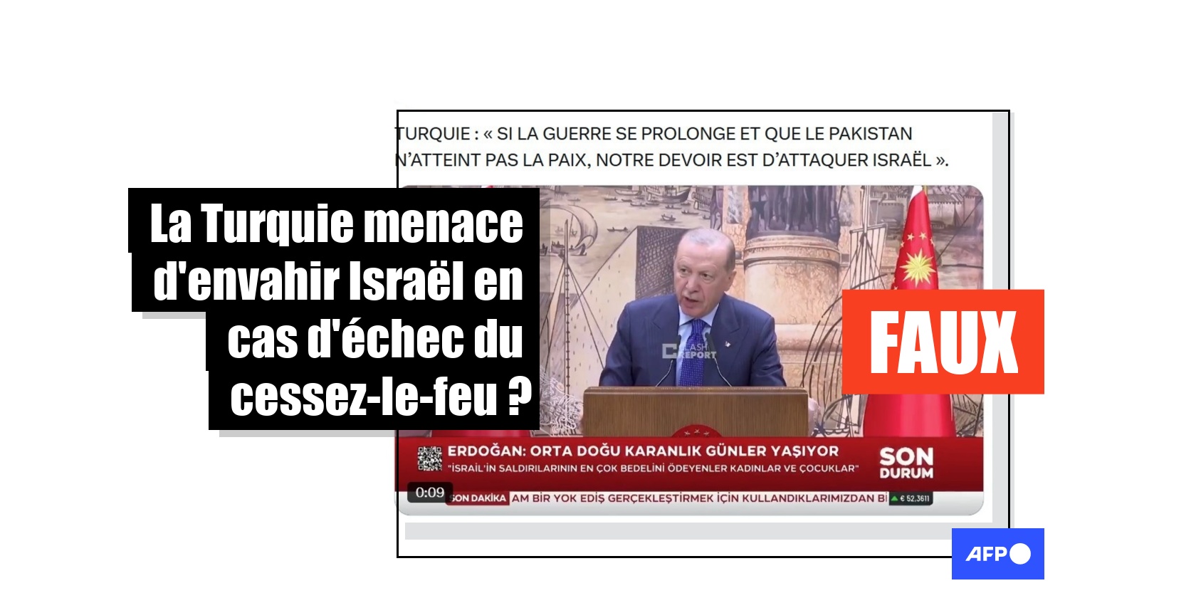 L'AFP a vérifié les extraits vidéo des discours partagés par les publications trompeuses, afin de déterminer si ces propos ont bien été tenus par le chef d'Etat dans le cadre des récents développements de la guerre au Moyen-Orient. Ainsi, un extrait de discours de Recep Tayyip Erdogan d'une trentaine de secondes accompagne régulièrement les publications trompeuses, qui lui prêtent la phrase : "Si la guerre continue et que le Pakistan ne parvient pas à amener la paix, notre devoir est d'attaquer Israël".