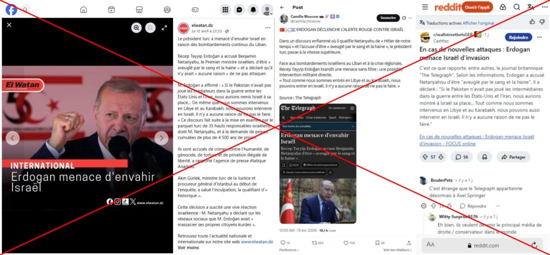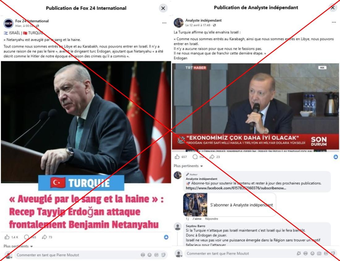 "Le président turc a menacé d'envahir Israël en raison des bombardements continus du Liban", prétend un internaute dans un post Facebook publié le 12 avril et cumulant plus de 3.000 "J'aime", accompagné d'une citation attribuée à M. Erdogan : "Si le Pakistan n'avait pas joué les médiateurs dans la guerre entre les États-Unis et l'Iran, nous aurions remis Israël à sa place… De même que nous sommes intervenus en Libye et au Karabakh, nous pouvons intervenir en Israël. Il n'y a aucune raison de ne pas le faire".