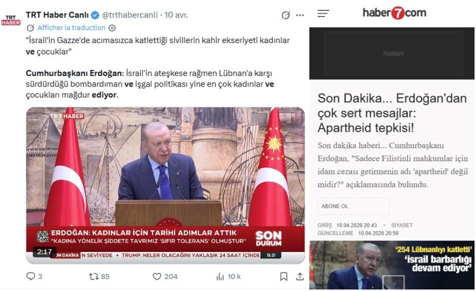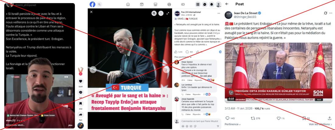 D'autres citations attribuées au président turc Recep Tayyip Erdogan, adepte de formulations musclées, ont également circulé au même moment sur la plupart des plateformes : des publications selon lesquelles le chef d'Etat aurait récemment déclaré que "notre devoir est d'attaquer Israël" si le cessez-le-feu avec l'Iran était rompu, que Benjamin Netanyahu serait le "Hitler de notre temps", "aveuglé par le sang et la haine", ou que "toute attaque contre le Liban sera désormais considérée comme une attaque sur la Turquie" (lien archivé ici).