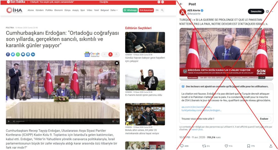 D'autres citations, comme : "De même que nous sommes intervenus en Libye et au Karabakh, nous pouvons intervenir en Israël. Il n'y a aucune raison de ne pas le faire", sont parfois accolées à des extraits provenant du discours du 10 mars 2026 - mais on ne retrouve pas non plus cette phrase dans le texte du discours prononcé à Istanbul au sommet de l'Icapp en 2026.