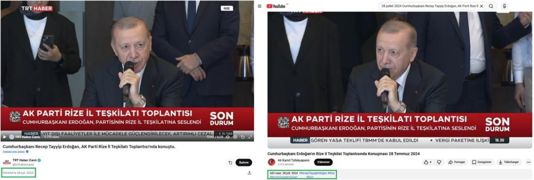 Une recherche d'image inversée, combinée avec une recherche par mots-clés reprenant l'intitulé du bandeau visible sur la vidéo, permet de retrouver le discours dont est issu l'extrait : il s'agit d'une prise de parole du président turc à Rize, en Turquie, devant une section locale de son parti, l'AKP, en 2024 (lien archivé ici).