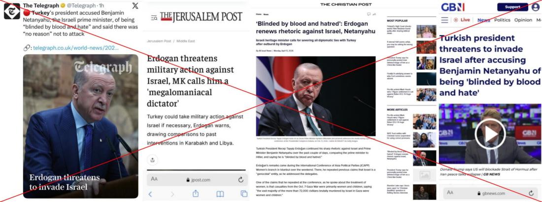 Le second réfute l'information selon laquelle "la Turquie aurait proféré des menaces d'invasion contre Israël", attribuées à Recep Tayyip Erdogan par "certains organes de presse et publications sur les réseaux sociaux" (lien archivé ici). Outre des internautes sur les réseaux sociaux, certains médias ont en effet également relayé ces prétendus propos, comme le site d'informations conservateur britannique GB News, le journal israélien Jerusalem Post ou le quotidien The Telegraph. Les deux quotidiens ont ensuite supprimé leurs articles.