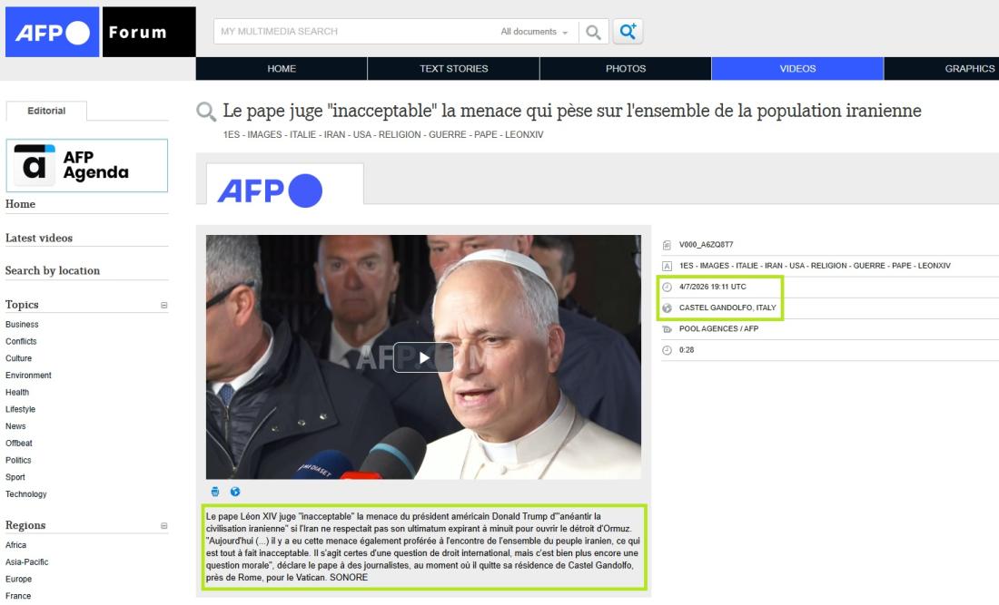 Cet entretien est également disponible sur AFP Forum, la plateforme de distribution de l'AFP. Il y est précisé que le pape Léon XIV a jugé "inacceptable" la menace de Donald Trump d'"anéantir la civilisation iranienne" si l'Iran ne respectait pas son ultimatum expirant à minuit pour ouvrir le détroit d'Ormuz (lien archivé ici).