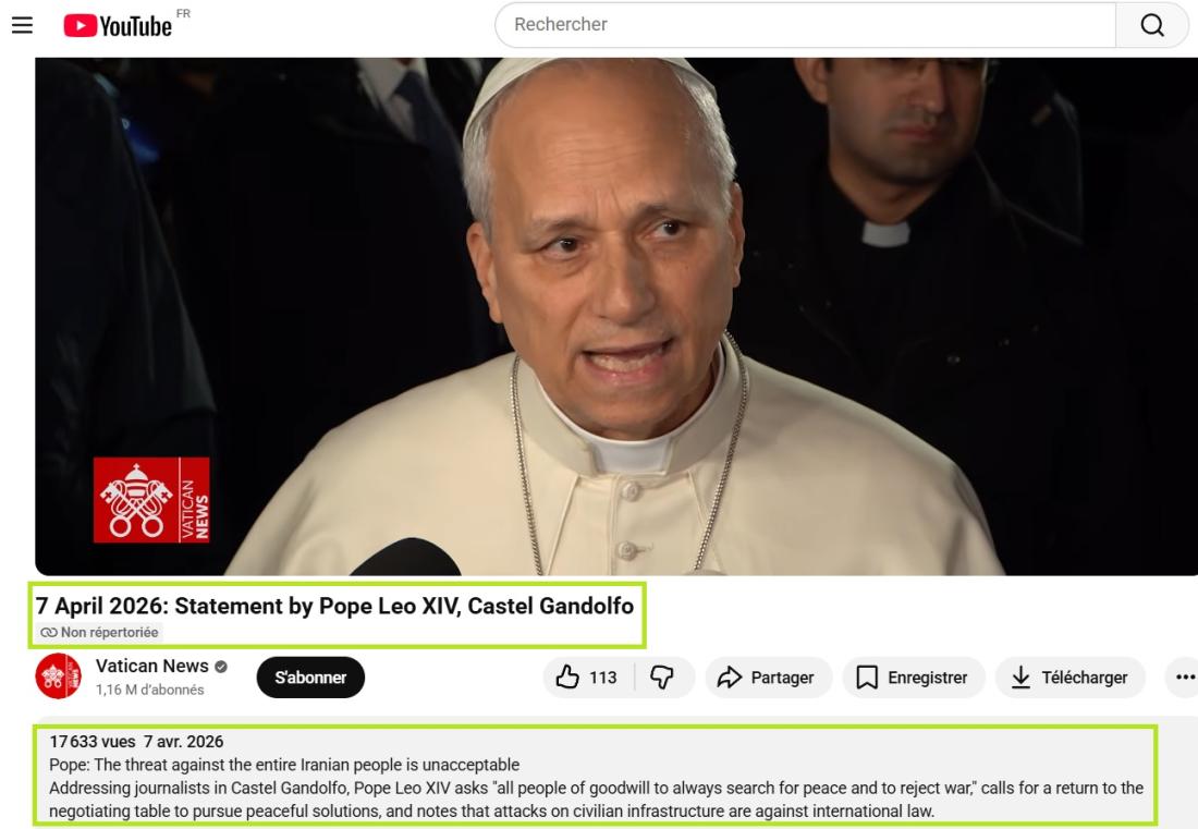 "Aujourd'hui [7 avril 2026], il y a eu cette menace également proférée à l'encontre de l'ensemble du peuple iranien, ce qui est tout à fait inacceptable. Il s'agit certes d'une question de droit international, mais c'est bien plus encore une question morale", a déclaré le pape aux journalistes alors qu'il quittait sa résidence de Castel Gandolfo, près de Rome, pour le Vatican (lien archivé ici).