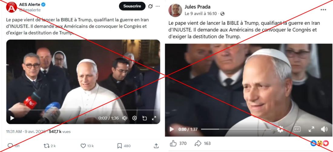 "Le pape vient de lancer la BIBLE à Trump, qualifiant la guerre en Iran d'INJUSTE. Il demande aux Américains de convoquer le Congrès et d'exiger la destitution de Trump", peut-on lire dans une publication X, partagée plus de 2.000 fois et cumulant plus de 547.000 vues depuis le 9 avril.