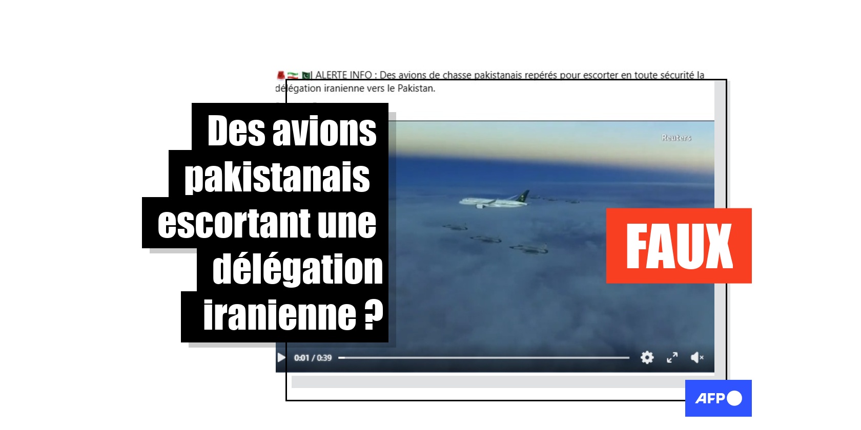 Des pourparlers entre les Etats-Unis et l’Iran pour mettre durablement fin à la guerre au Moyen-Orient se sont tenus du 11 au 12 avril 2026 à Islamabad, au Pakistan. Dans ce contexte, de nombreuses publications sur les réseaux sociaux affirment à tort qu’une vidéo montrerait des avions de chasse pakistanais protégeant la délégation iranienne à son arrivée à Islamabad. Mais ces images ont en réalité été tournées en février 2019 et montrent l'accueil protocolaire du prince héritier saoudien Mohammed ben Salmane lors d'une visite au Pakistan.
