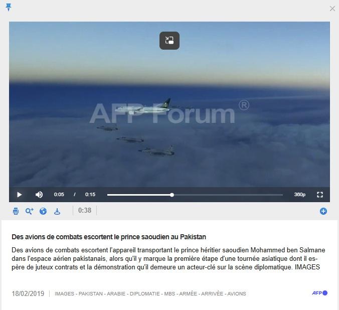 On retrouve aussi cette vidéo sur le site de RadioFreeEurope, publiée là encore le 18 février 2019. La légende est cette fois-ci plus explicite : "Le Pakistan a dépêché des avions de chasse pour accueillir l'avion du prince héritier saoudien Mohammed ben Salmane , en prévision d'une visite très médiatisée le 17 février" 2019 (lien archivé ici).