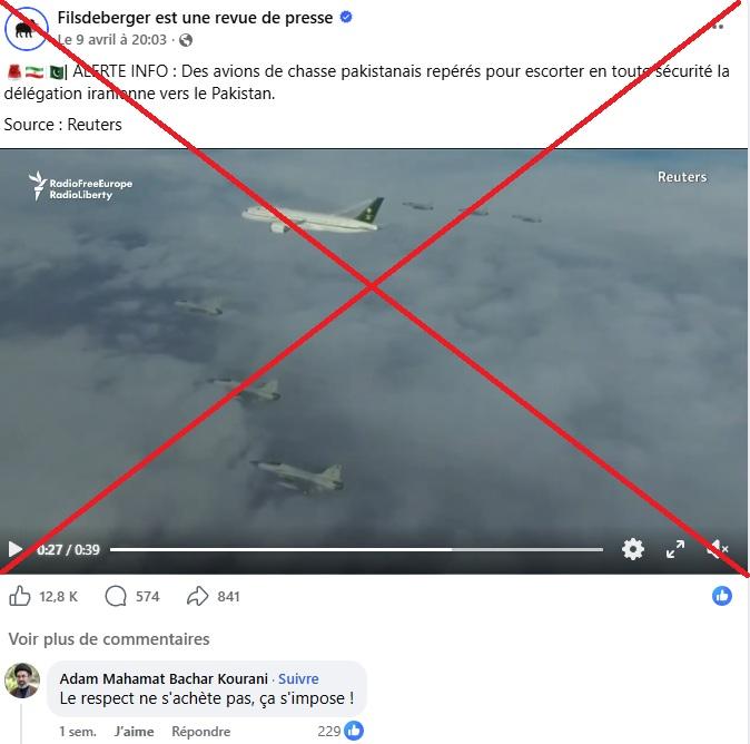 "ALERTE INFO : Des avions de chasse pakistanais repérés pour escorter en toute sécurité la délégation iranienne vers le Pakistan", peut-on ainsi lire dans une publication Facebook qui cumule plus de 1.400 mentions "j’aime" depuis le 9 avril 2026.