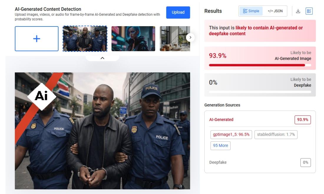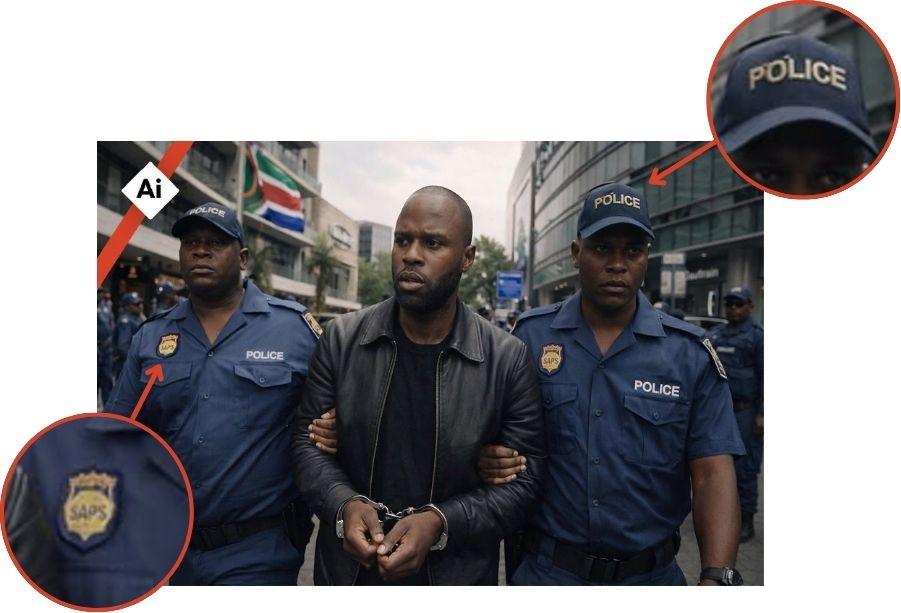 Cependant, plusieurs incohérences visuelles font planer le doute sur leur authenticité. Sur le premier cliché, les pseudo-membres de la police sud-africaine portent un uniforme qui diffère de l'habit traditionnel du Service de police sud-africain (SAPS).