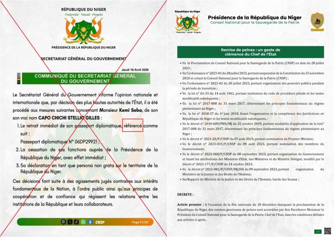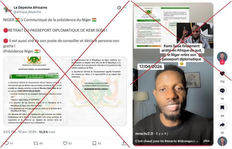 Ainsi, de nombreuses publications prétendent dévoiler un soi-disant communiqué dans lequel la Présidence nigérienne annoncerait avoir "retiré" son passeport diplomatique à l'influenceur. D'autres assurent montrer des photos de l'arrestation de M. Seba.