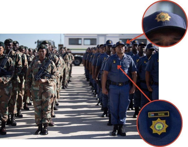 Sur leur casquette, on peut lire la mention "police", alors qu'elle devrait être ornée d'un écusson en forme d'étoile à huit branches. Aussi, l'insigne visible sur leur chemise diffère de celui habituellement porté par les SAPS.