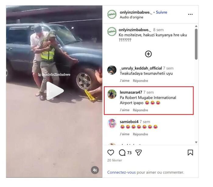 Avec ces éléments en tête et à force de recherches d’images inversées, on retombe sur une publication Instagram reprenant la même vidéo, sous laquelle un internaute suggère dans un commentaire rédigé en shona - une langue parlée principalement au Zimbabwe - que la scène aurait eu lieu à l’aéroport international Robert Mugabe d’Harare, la capitale du Zimbabwe (liens archivés ici et ici).