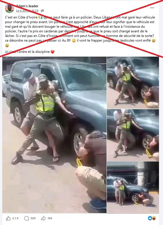 Alors que deux Libanais auraient "mal garé leur véhicule pour changer le pneu avant", "un policier ivoirien est venu leur signifier" qu’il fallait le "bouger", est-il ainsi raconté dans un post Facebook cumulant 2.100 mentions "j’aime" depuis sa publication le 4 avril. "Les Libanais ont refusé et face à l'insistance du policier", l'un "l'a pris en cadenas par derrière jusqu'à ce que le pneu soit changé avant de le lâcher", affirme la publication.
