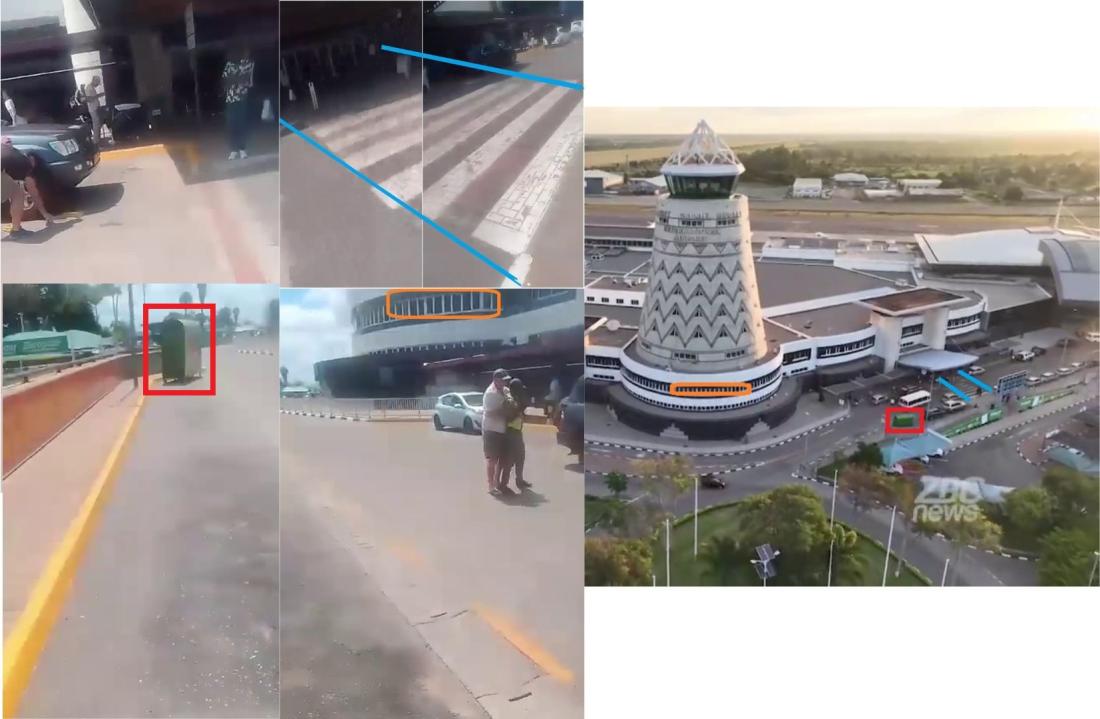 On reconnait ainsi dans ce reportage de la télévision nationale ZBC, figurant dans le même ordre : une benne verte, les fenêtres caractéristiques du bâtiment de l’aéroport et l’auvent de l’entrée surplombant le passage piéton (éléments encadrés dans les photos suivantes, lien archivé ici).