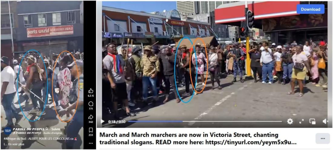 Nous avons aussi pu confirmer qu’elle montre une marche anti-migrants survenue le mardi 21 avril 2026 dans cette ville, en identifiant plusieurs personnes qu’on retrouve dans des vidéos de cette manifestation publiées par des médias sud-africains, comme ici ou là (liens archivés ici et ici).