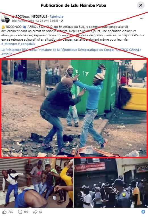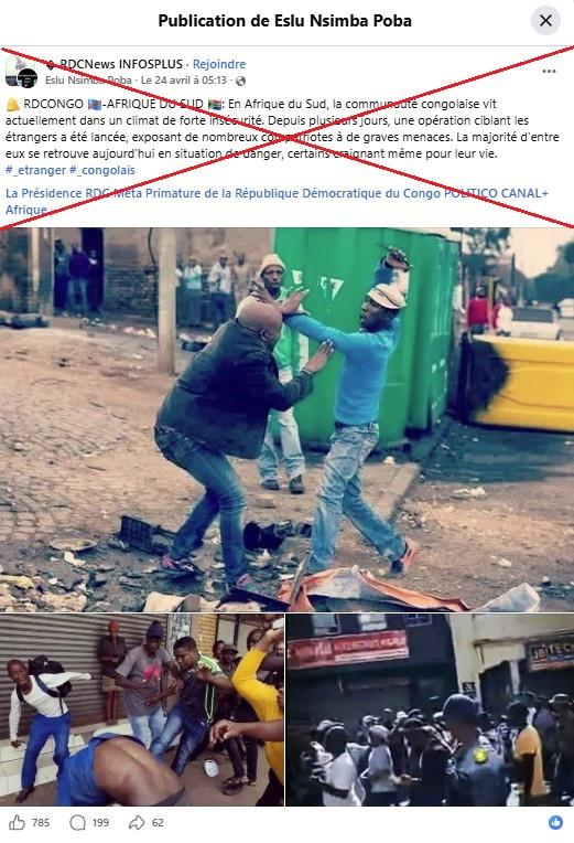 "En Afrique du Sud, la communauté congolaise vit actuellement dans un climat de forte insécurité (…) une opération ciblant les étrangers a été lancée ", prétend ainsi cette publication, relayée sur Facebook qui cumule plus de 700 mentions "j’aime" depuis le 24 avril 2026.