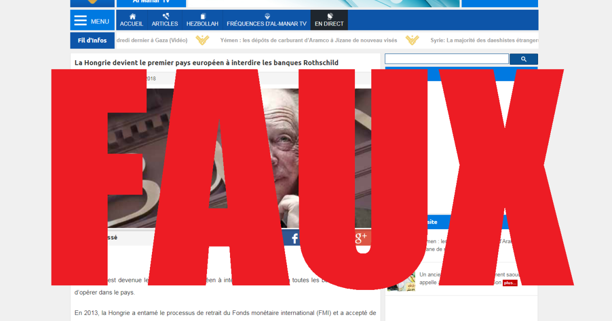 Publié par trueactivist.com, l'article de septembre 2016 "Victory! Hungary Becomes First European Nation To Ban Rothschild Banks" a ainsi été partagé plus de 4.500 fois sur Facebook. al-Manar, le groupe de presse du mouvement chiite libanais Hezbollah, a publié lui le 2 avril une version de cet article en français.