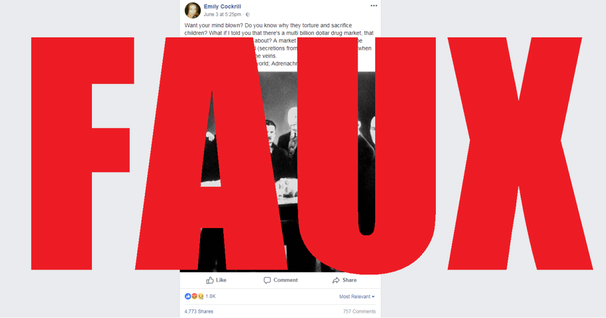 Ces quelques lignes glaçantes ont réuni près de 5.000 partages sur Facebook. Plusieurs autres publications populaires dénoncent aussi ces pratiques visant soi-disant à torturer des enfants pour récolter l’adrénochrome dans leurs cerveaux.