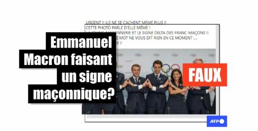 Image Publié le 12/07/2021 Cette photo montre Emmanuel Macron mimant le symbole des JO 2024 de Paris et non un signe franc-maçon