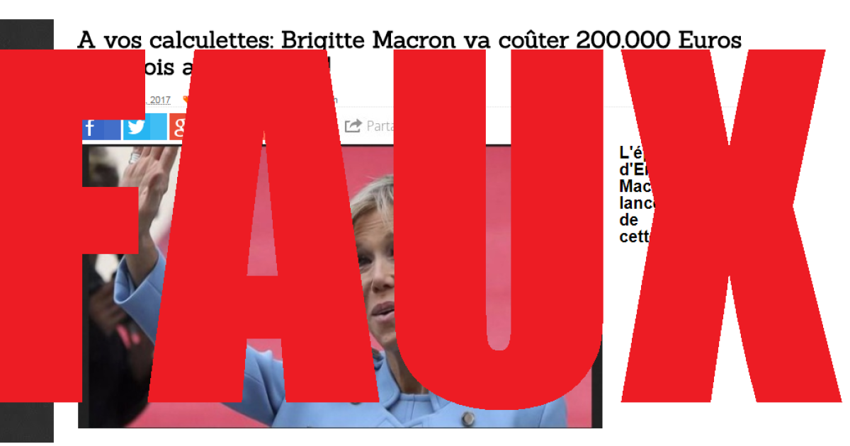 75.000€ par mois pour rémunérer ses collaborateurs, 45.000€ pour une voiture de fonction, 15.000€ de maquillage et 50.000€ de frais de représentation, c'est le budget de Brigitte Macron selon un article devenu viral. Cette fausse information, originellement publiée sur le blog de Jean-Noël Le Guillou, a été reprise par plusieurs sites. Au total, ces articles ont réuni plus de 70.000 partages sur les réseaux sociaux.