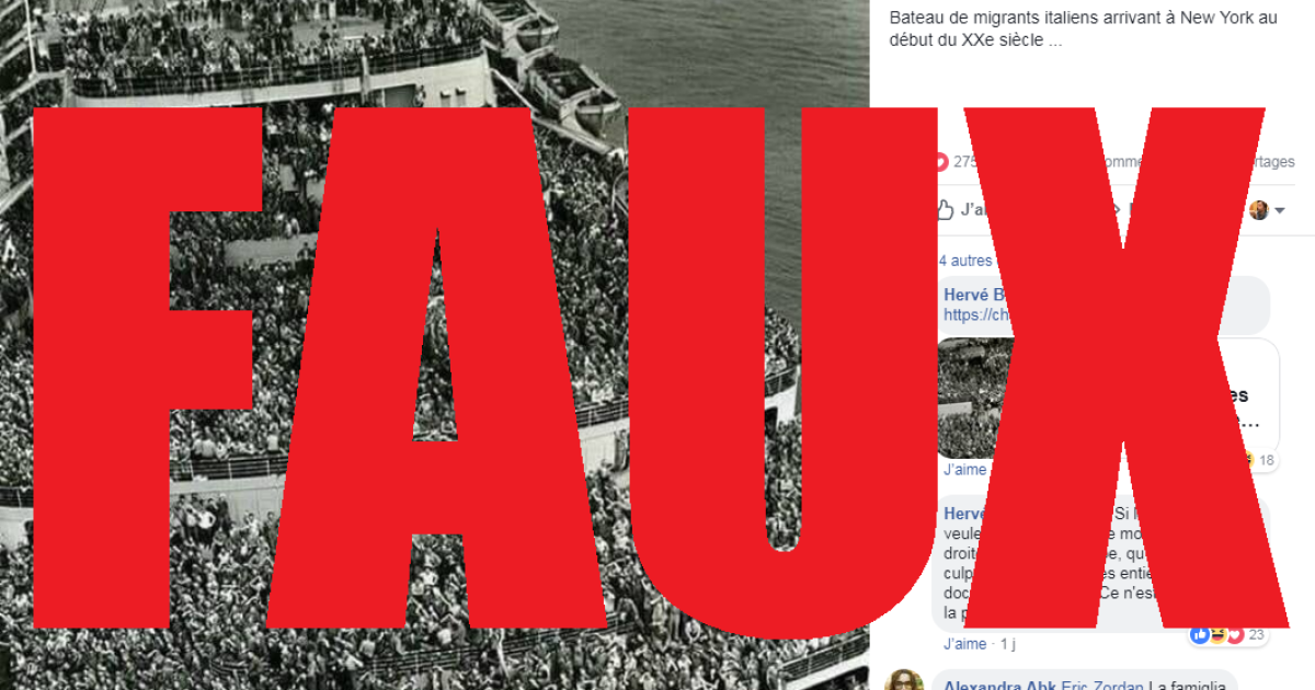 Partagée plus de 60.000 fois dans différentes publications en français, italien, anglais ou espagnol, cette photo est légendée ainsi : "Bateau de migrants italiens arrivant à New York au début du XXe siècle ..."
