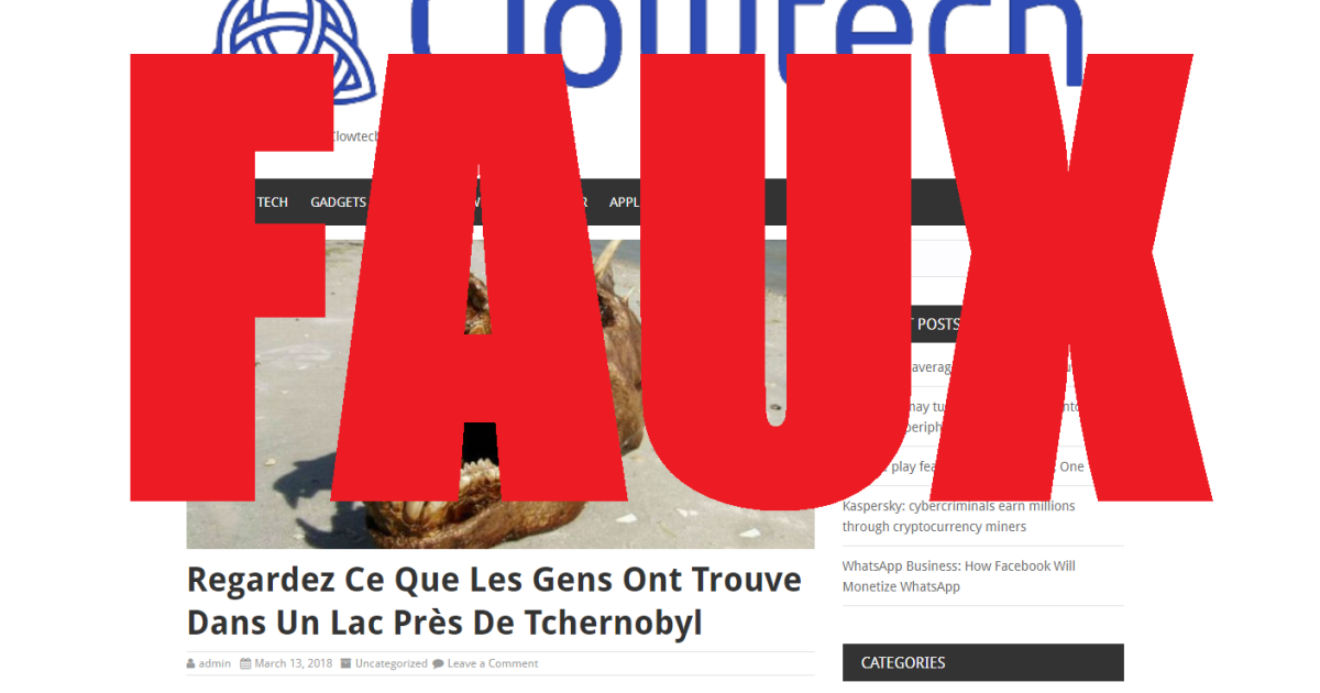 Un article de clowtech.com présente un squelette terrifiant en photo avec pour titre "Regardez ce que les gens ont trouvé dans un lac près de Tchernobyl". Il s'agit en réalité d'une réalisation de l'artiste Juan Cabana, promoteur d'un "art océanique".