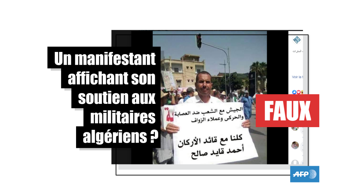 Publiée le 07 septembre sur la page Facebook algérienne, Viva Algeria, la photo a été partagée plus de 600 fois. Sur la pancarte que brandit le manifestant, le slogan est écrit en arabe : “l’armée est avec le peuple, contre les bandits, les harkis et les falsificateurs. Nous sommes tous avec Gaïd Salah, le chef de l’état-major”.