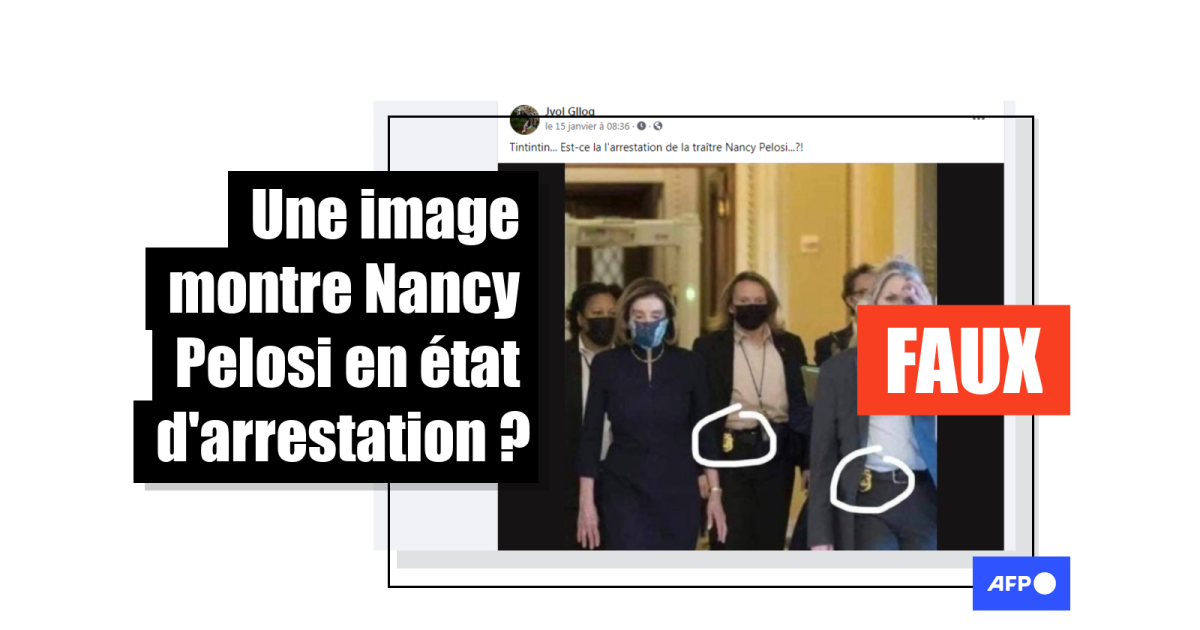 Les affirmations selon lesquelles Nancy Pelosi aurait été arrêtée ou serait sous la surveillance du United States Marshals Service (USMS), agence fédérale spécialisée dans la recherche des fugitifs, sont "fausses", a affirmé dans un courriel à l'AFP le directeur adjoint du cabinet de Nancy Pelosi, Drew Hammill.