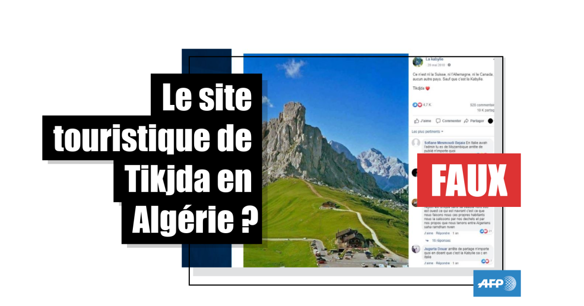 En réalité, la photo ne montre pas le versant sud du massif algérien du Djurdjura, mais le col de Giau, au nord-est de l'Italie, comme mis en évidence par une recherche d'images inversées.