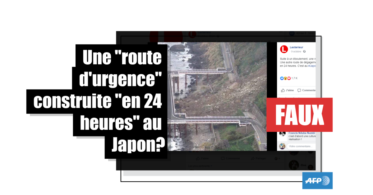 "Route d’urgence construite au Japon en 24 HEURES !! (...) Combien d'heures cela prendra dans votre pays?", s'interroge l'auteur de l'une de ces publications, alors que le Japon panse ses plaies après le passage du typhon Hagibis, qui a fait plus de 80 morts dans le pays il y a dix jours.