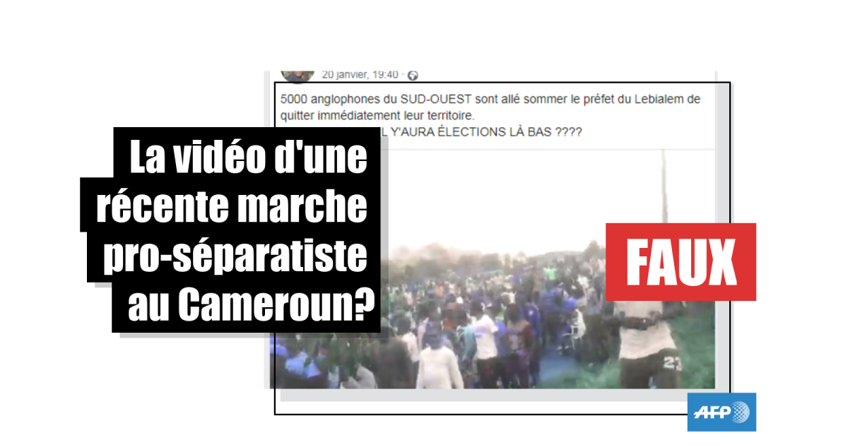 Les élections législatives et municipales du 9 février 2020 auront-elles lieu dans la partie anglophone du Cameroun? L’auteur d’une publication sur Facebook laisse croire que non, en publiant une vidéo qui montre une marche de contestation populaire dans la localité de Lebialem, en soutien au mouvement séparatiste. L’auteur affirme qu'une foule de 5000 personnes a exigé le départ de l'autorité locale. Il ajoute en commentaire que la scène a eu lieu au matin du 20 janvier 2020. Il a depuis supprimé sa publication.