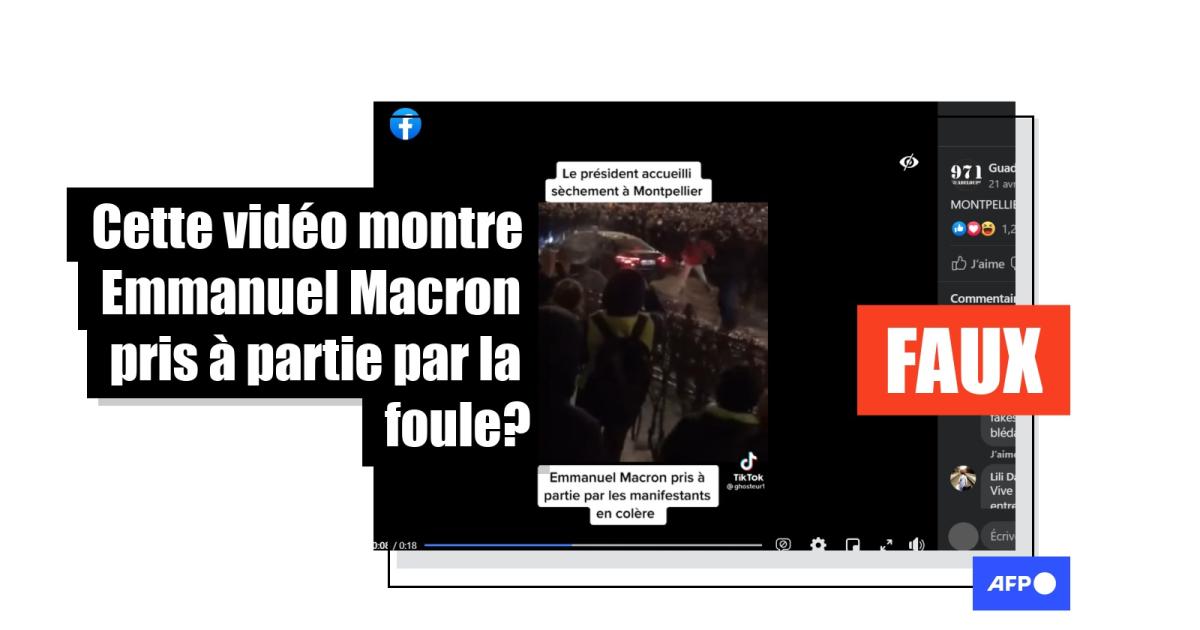 "Le président accueilli sèchement à Montpellier" et "pris à partie par les manifestants", peut-on lire en légende de la vidéo partagée plus de 10.400 fois à partir de cette publication Facebook du groupe "Guadeloupéens Guadeloupéennes". Le montage a d'abord été diffusé sur TikTok le 21 avril par @ghosteur1. Son compte est facilement retrouvable, son nom apparaissant sur la vidéo.