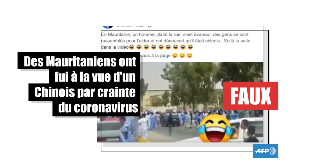 “En Mauritanie, un homme, dans la rue, s’est évanoui, des gens se sont rassemblés pour l’aider et ont découvert qu’il était chinois”, lit-on dans la légende de cette vidéo, postée, entre autres, par la page Rumeur du Gabon et ayant récolté 50 partages depuis sa publication le 5 février.