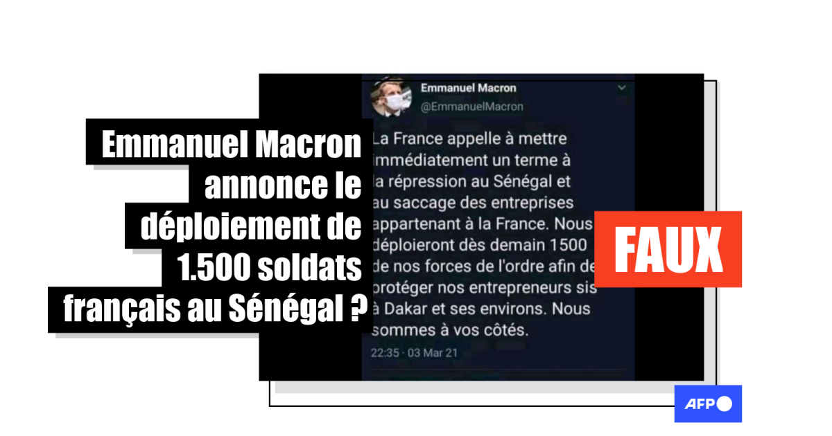 Les prétendues annonces formulées dans ce faux tweet sont par ailleurs tout aussi mensongères: la France n'a pas déployé 1.500 soldats supplémentaires au Sénégal en réponse aux troubles qui ont émaillé Dakar le 3 mars.
