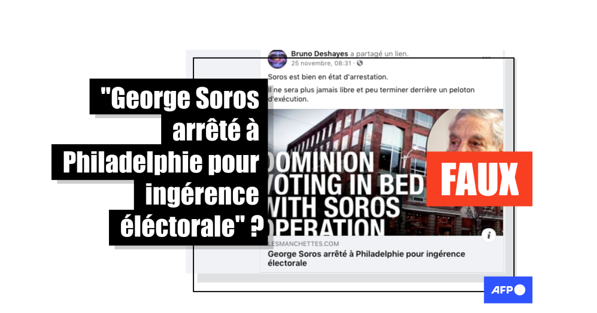 "La nouvelle de l'heure ! George Soros est arrêté ! On l'a arrêté pour interférence dans les élections présidentielles, c'est arrivé le 23 novembre !", affirme, sans citer de source, une internaute québécoise dans une vidéo partagée près de 3.000 fois en moins d'une semaine.