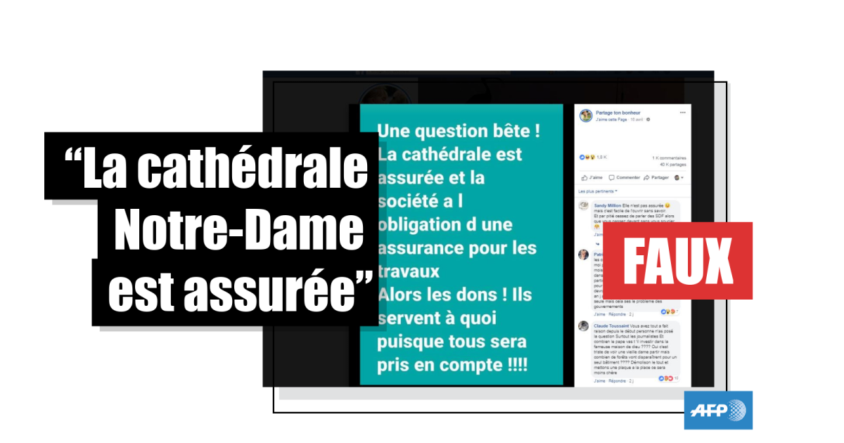 Mardi soir, au moment où la page Facebook “Partage ton bonheur” publie ce message très partagé, 700 millions d’euros avaient déjà été promis par le secteur privé pour aider à la reconstruction de la cathédrale de Paris. L’intégralité de la toiture et de sa charpente ainsi qu’une partie de la voûte ont été détruites par l’incendie de la soirée du 15 avril.