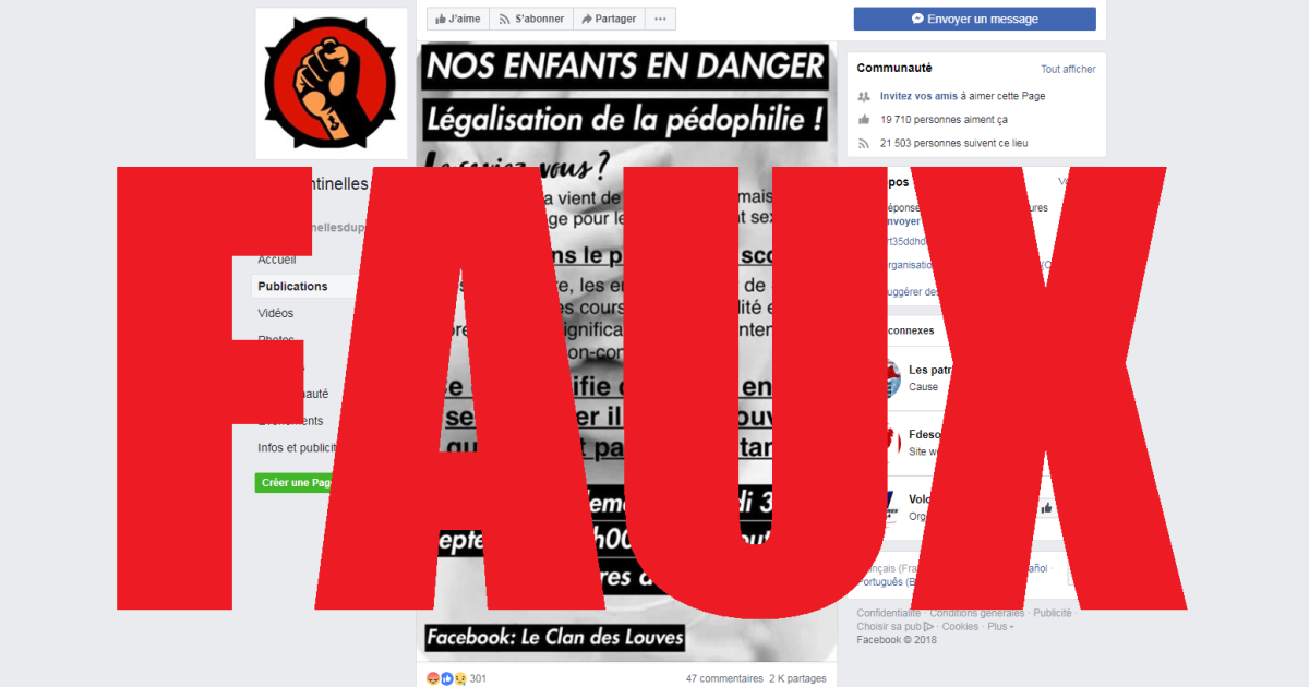 Le visuel en question, diffusé sur la page Facebook "Les Sentinelles du Peuple" et partagé ensuite par près de 2.000 utilisateurs, appelle à un "rassemblement le lundi 3 septembre devant toutes les Préfectures de France". Selon ce visuel, "nos enfants (sont) en danger: légalisation de la pédophilie!"