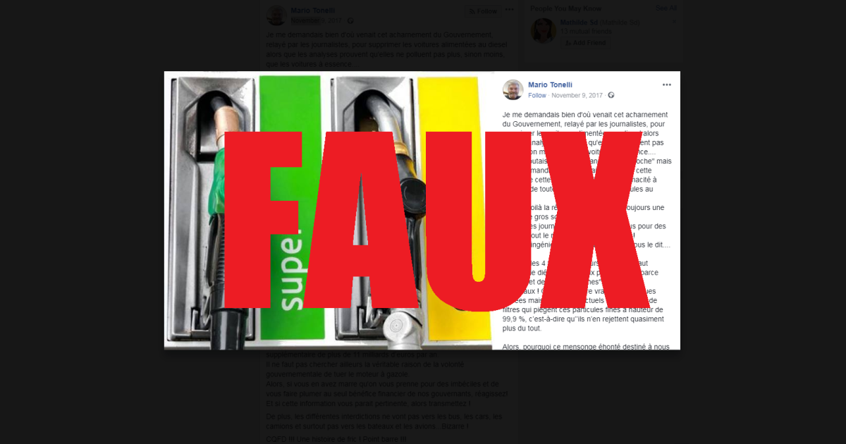 Plus de 650.000 personnes ont partagé une publication de novembre 2017 qui accuse le gouvernement d’injustement s’acharner les véhicules à moteur diesel pour des raisons financières. “Je me demandais bien où était l'intérêt de cette fureur, de cette obstination et de cette ténacité à éliminer de toute urgence tous les véhicules au diésel !”, explique l’auteur.