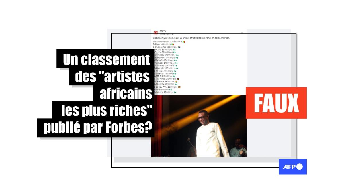 Youssou N’Dour, Akon, Black Coffee... Des publications partagées plus de 4.000 fois sur Facebook ces dernières semaines et très commentées par les internautes (1, 2, 3, 4, 5...) prétendent relayer un "classement 2021" des "artistes africains les plus riches en millions de dollars", réalisé par le magazine américain Forbes.