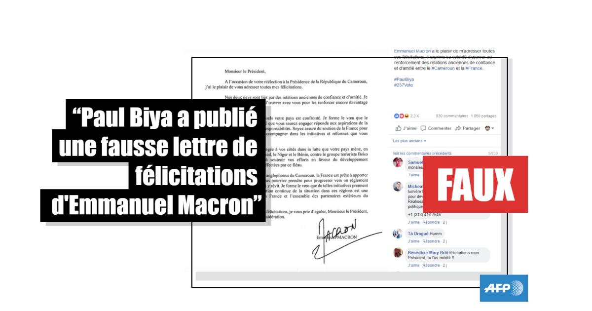 Au lendemain du post Facebook du président Paul Biya, de nombreux sites d’information camerounais, à l’instar du pureplayer Camerounweb.com, ont affirmé que la lettre publiée par Paul Biya était un faux grossier, en mettant en lumière des différences présumées entre la signature d’Emmanuel Macron et le paraphe présent sur la lettre de félicitations reçue par le président du Cameroun.