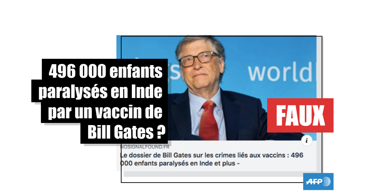 "Les médecins indiens accusent M. Gates d’une épidémie dévastatrice de polio à souches vaccinales qui a paralysé 496 000 enfants entre 2000 et 2017. En 2017, le gouvernement indien a abandonné le régime de vaccination de M. Gates et l’a expulsé. Le taux de paralysie due à la polio a chuté de façon précipité" : c’est ce qu’affirme un article, publié sur le site No Signal Found, et partagé plus de 3500 fois dans des groupes Facebook (1,2) depuis le 27 avril.