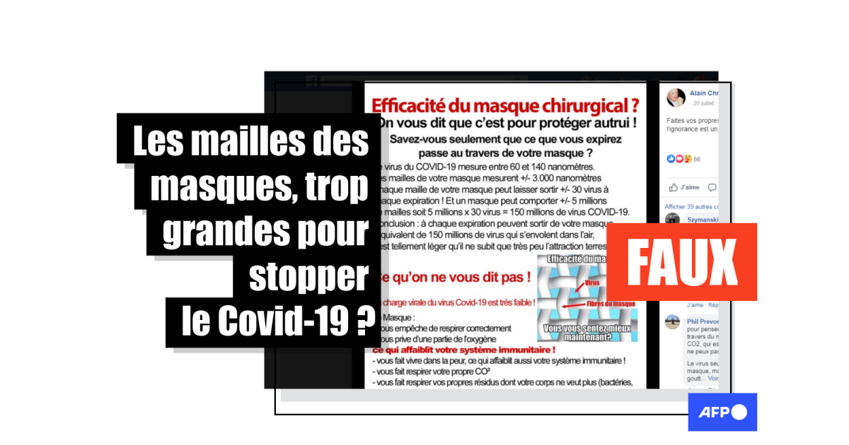 "Le virus COVID-19 mesure entre 60 et 140 nanomètres. Les mailles de votre masque mesurent +/- 3.000 nanomètres. Chaque maille de votre masque peut laisser sortir +/- 30 virus à chaque expiration !", explique un visuel très partagé sur Facebook depuis le 20 juillet et l'entrée en vigueur en France de l'obligation du port du masque dans les lieux publics clos. Le même argument figure dans une autre publication Facebook qui compare les pores de la maille du masque "à un tunnel de métro" qui laisserait circuler le virus.
