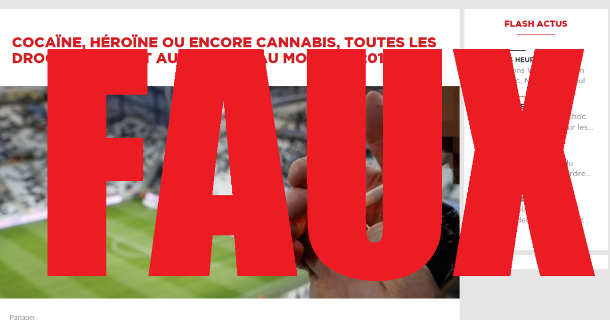 La rumeur va bon train, reprise par des dizaines de sites, dans plusieurs langues, expliquant que les spectateurs pourront consommer du cannabis, de l’héroïne et de la cocaïne dans les stades de la Coupe du monde, qui commence le 14 juin en Russie. "Qu’ils s’agissent de cocaïne, de cannabis, et même d’héroïne, le pays n’interdit aucune introduction ni le transfert de ces drogues", lit-on sur un article partagé plus de 1.500 fois. "La sécurité à l'intérieur d'un stade sera forcément remise en cause en cas de problèmes liés à la surconsommation de drogue."