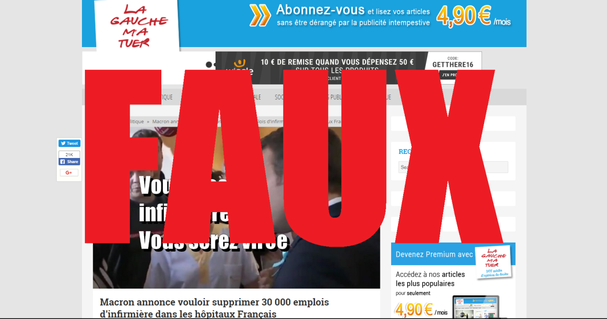 “Macron annonce vouloir supprimer 30.000 emplois d’infirmière [sic] dans les hôpitaux Français”, c’est l’affirmation erronée diffusée par le site d’extrême droite La Gauche M’a Tuer le 31 mai 2018. Avec au moins 10.000 partages, principalement réunis par ces deux posts sur Facebook mais aussi via ce blog, l'article a été largement diffusé. Il a déjà été corrigé par nos confrères du Monde.