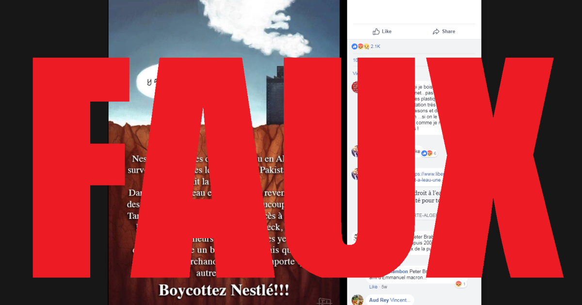 Nestlé aurait “acquis les droits sur l’eau” en Algérie et au Pakistan, empêchant la population d’accéder à cette eau afin de la revendre au prix fort, selon une image virale qui a accumulé plus de 100.000 partages sur Facebook. Nestlé Waters, leader mondial de l'eau en bouteille, dément vigoureusement l'accusation.
