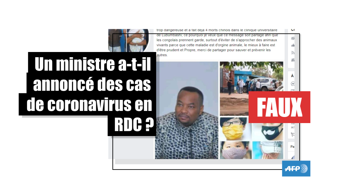 "URGENT. LE MINISTRE DE LA SANTÉ CONFIRME LA PRÉSENCE DU CORONAVIRUS EN RDC PRÉCISÉMENT À LUBUMBASHI ET APPELE LES CONGOLAIS À LA PRUDENCE” (sic) clame une publication Facebook partagée plus de 1.700 fois depuis le 6 février.
