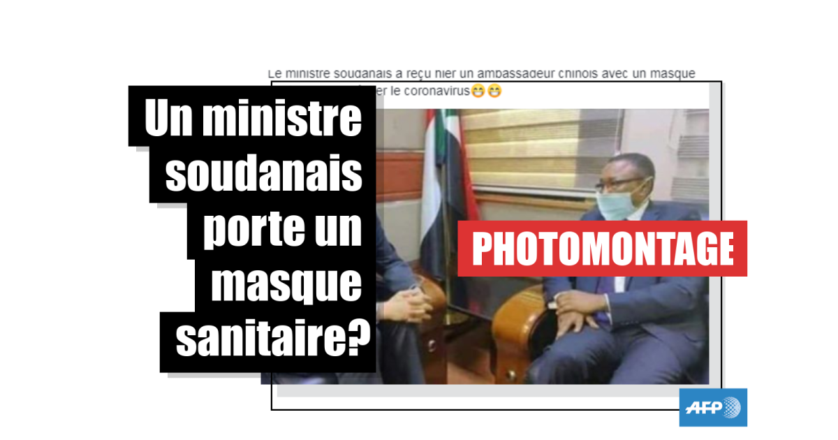 La photo montre un homme en costume, masque sanitaire cachant son nez et sa bouche, face à un autre homme qui lui, esquisse un sourire. Le drapeau soudanais trône au centre de cette image. La légende prétend que "le ministre soudanais a reçu hier, un ambassadeur chinois avec un masque sur le nez pour éviter le virus Corona" (sic). Le cliché et sa légende sont relayés dans des pages Facebook, au Tchad, en République démocratique du Congo, au Niger, entre autres,(1,2,3,4); suscitant à chaque fois l'hilarité de certains internautes.