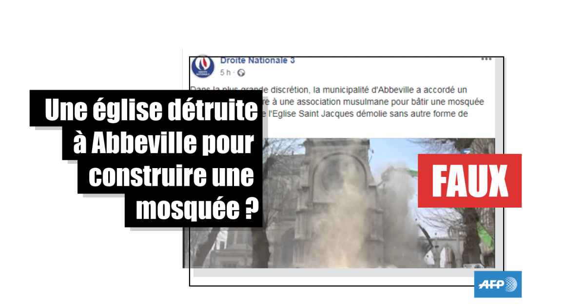 Son article est intitulé de manière trompeuse: “ABBEVILLE : L'ÉGLISE SAINT-JACQUES DÉMOLIE POUR CONSTRUIRE UNE MOSQUÉE !” et s’appuie sur plusieurs sources decontextualisées, comme un reportage de France 3 relatant la démolition de l’église.