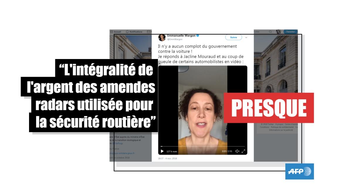 La déclaration de Mme Wargon est pourtant imprécise : d'après les chiffres du ministère de l'Intérieur publié le 23 octobre, plus de 91% des 1,013 milliard d'euros issus des amendes des radars automatiques en 2017, soit 924,5 millions d'euros, ont financé la lutte contre l'insécurité routière, notamment l'entretien et la modernisation du réseau routier. Les 8,8% restants, soit 88,7 millions d'euros, ont été affectés au désendettement de l'État.